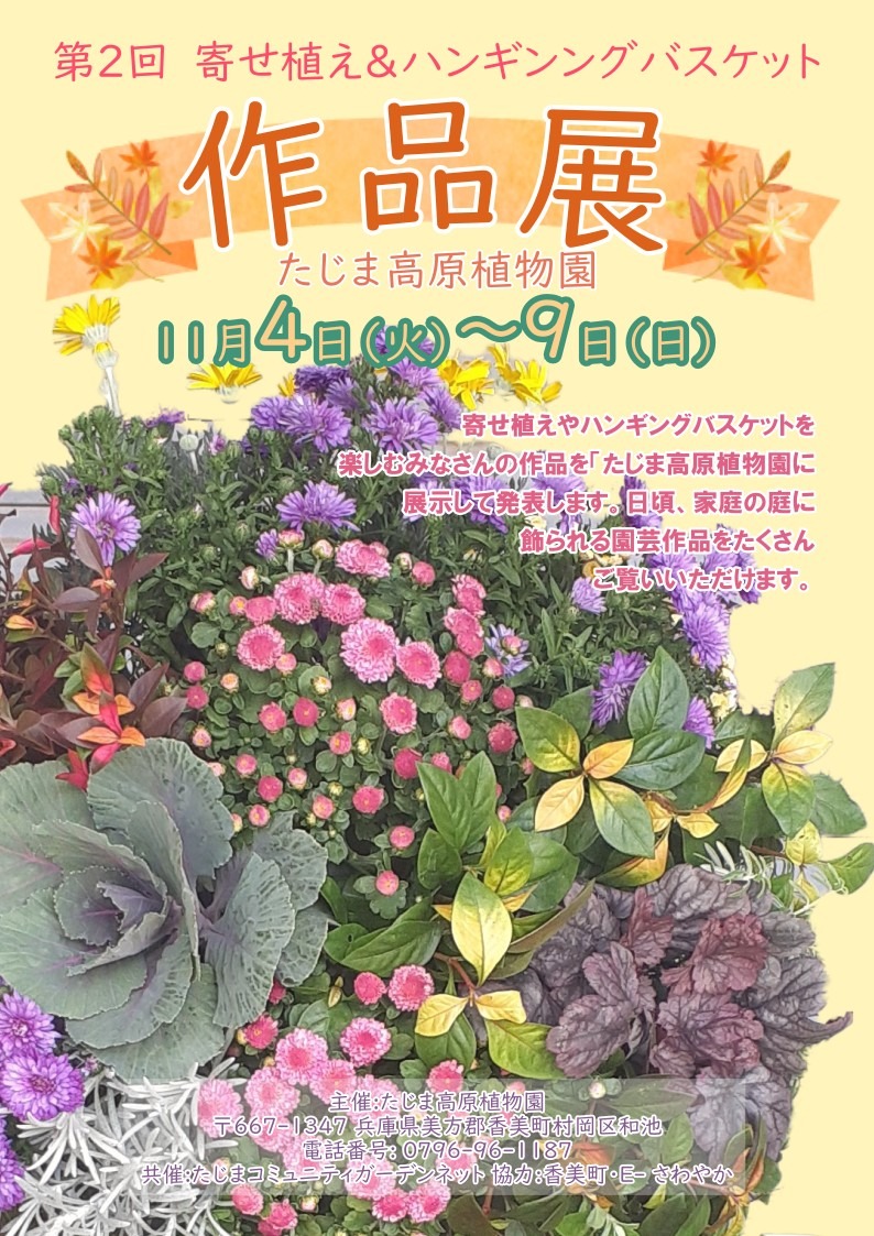寄せ植え&ハンギングバスケット作品展 寄せ植えやハンギングバスケットを楽しむ皆さんの作品を展示 令和7年11月4日(火)~9日(日)開催決定!寄せ植えチラシ.pdf エリア 村岡エリア カテゴリー 自然 展示・音楽 Loading... スライドショーで見る 基本情報 住所 〒667-1347 兵庫県美方郡香美町村岡区和池709 電話番号 0796-96-1187(たじま高原植物園) FAX 0796-96-1188 開催場所 たじま高原植物園 開催期間 2025年11月4日(火)~9日(日) 開催時間 9:00~17:00 ウェブサイト 公式WEBサイトたじま高原植物園