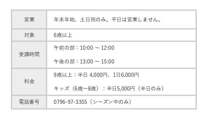 但馬地方のスキー場の中でも、安定した積雪量と雪質を誇るスキー場。 8人乗りゴンドラでゲレンデまでらくらくアクセスできます。シンプルながら起伏に富んだコースで、ビギナーから上級者まで幅広くお楽しみいただけます。また、ドッグランがあったり、キッズパークにムービングベルト・ふわふわ遊具も設置されていたりと、ペットと一緒に楽しみたいという方やお子様連れにも人気です!