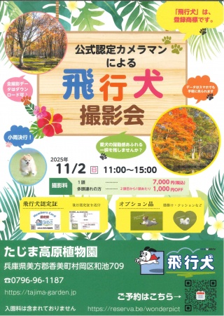村岡のイベント情報(11/2開催) 2025.10.30 イベント 新着 ☆第4回香美町ハロウィンこどもフェスタ11月2日(日)11:00-15:00 但馬高原植物園 イベント内容はこちら☆公式認定カメラマンによる「飛行犬撮影会」11月2日(日)11:00-15:00 但馬高原植物園 ☆秋のミニイベント11月2日(日)11:00頃から 道の駅ハチ北 イベント内容はこちら