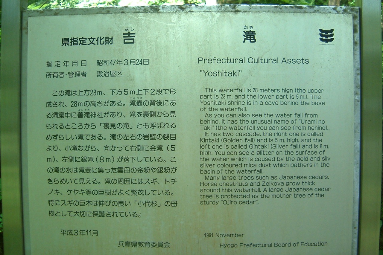 この滝は、滝壺の背後にある洞窟中に吉滝神社があり、滝を裏側から見られるところから「裏見の滝」とも呼ばれる大変珍しい滝で、県指定天然記念物に指定されています。裏側から眺めるとカーテンのように滝水が流れます。初夏の新緑や秋の紅葉は特におすすめです。