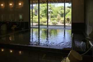 豊富な湯量と成分の良さが定評の村岡温泉は、総大理石のゆったりした浴槽が自慢です。浴場の窓からはきれいな庭園が心を和ませてくれます。脱衣所つづきには小さいながらも和室の休憩所もあり、のんびりごろ寝も楽しめそう。国道沿いという便利な立地も人気の理由です。