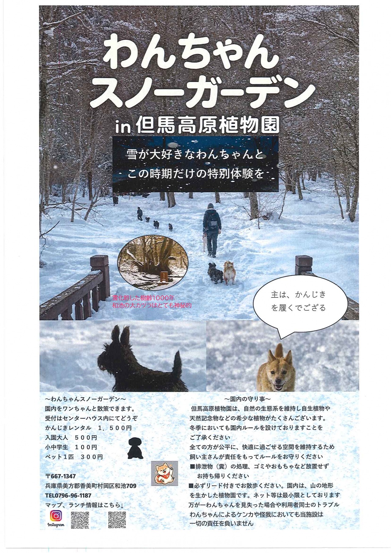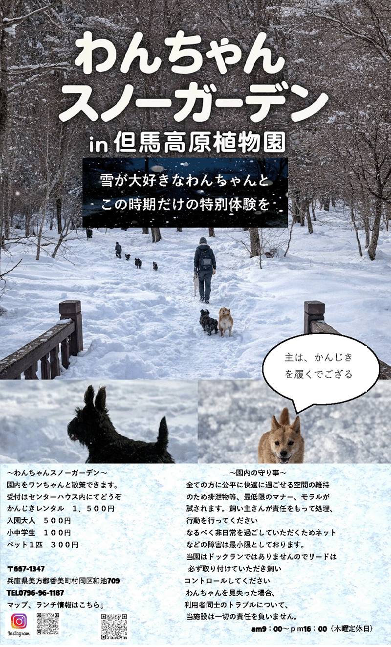 但馬高原植物園で12月末から3月下旬頃(積雪状況による)までわんちゃんと一緒に雪の中をお散歩できます。